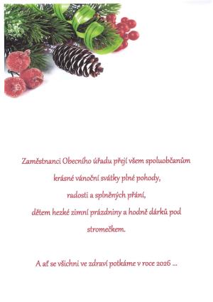 V měsíci LEDNU 2026 budou vybírány v pokladně Obecního úřadu pouze platby za nájem bytu. Ostatní poplatky začneme vybírat až od ÚNORA !!! (odpad, pes, kůlny, pozemky, hroby, atd.)